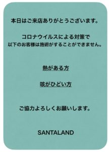 SANTALANDではコロナウィルス感染防止対策として明日4月22日(水)より御来店されたお客様に安心したお時間を過ごして頂く措置としまして、来店時に、検温をお願いします。